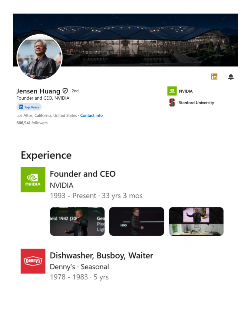 Es curioso porque, años más tarde, cuando ya dirigía NVIDIA, Huang seguiría utilizando ese mismo tipo de espacios para reunirse con otras personas importantes de Silicon Valley. Puede que sea puro marketing, o puede que sea una forma de decirle al mundo, lo mismo que transmite su perfil de LinkedIn, que las dos cosas lo definen.